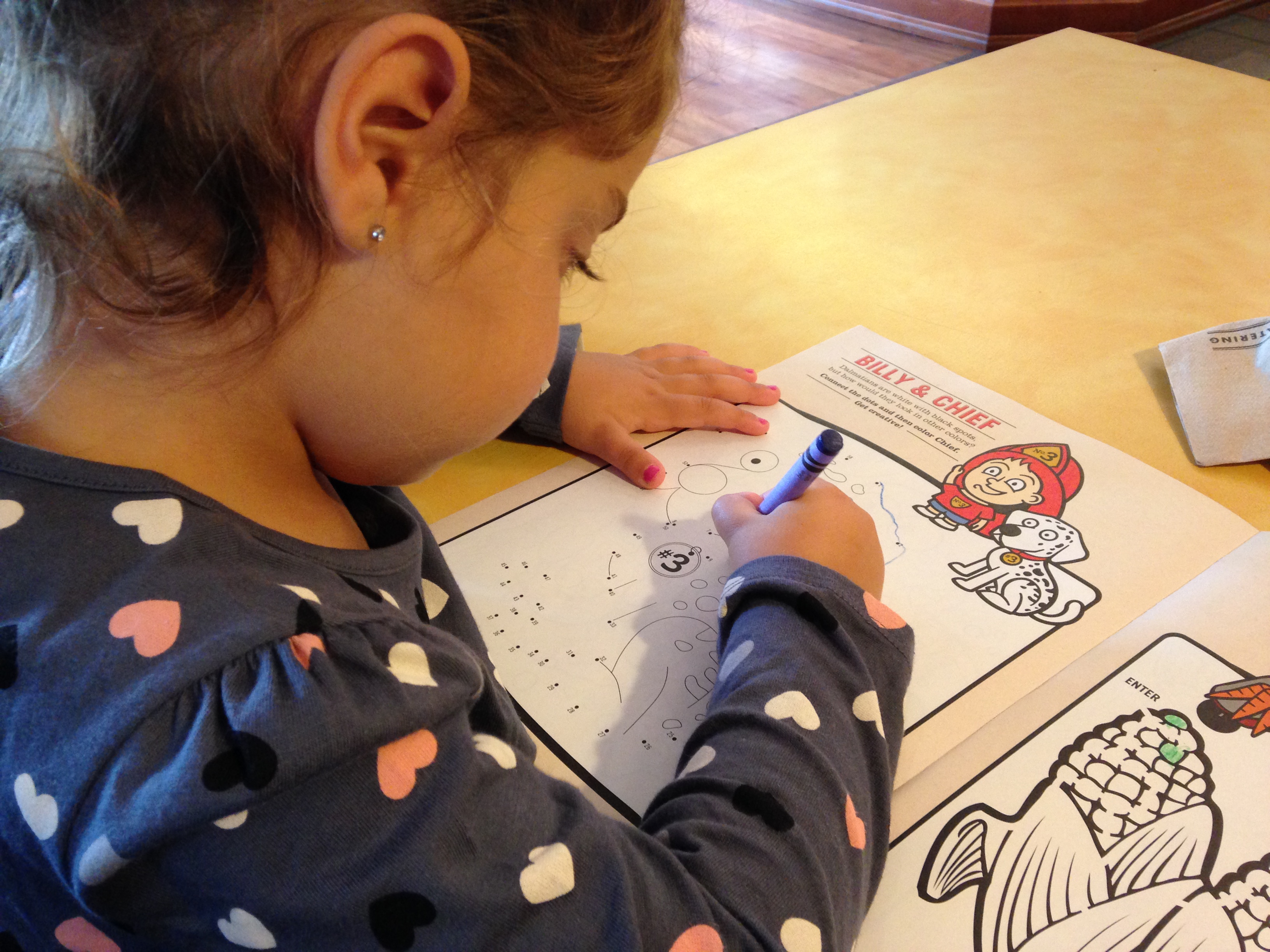 Sarah connects the dots while we wait for our food.