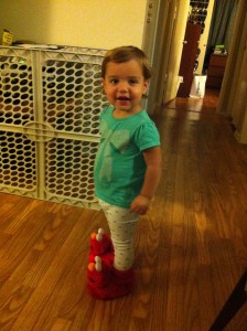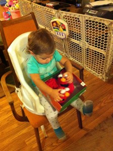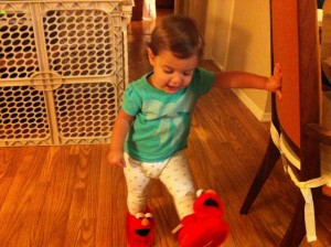 Sarah’s 1st gift was a pair of Elmo slippers. She was pretty cranky that night, but lit up after she saw the red furry monster.