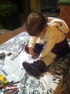 Here is Sarah in the kids area coloring on the special tablecloth.