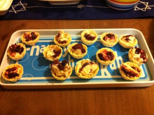 Phyllo cups with goat cheese and cranberry, store bought sweets and pizza!