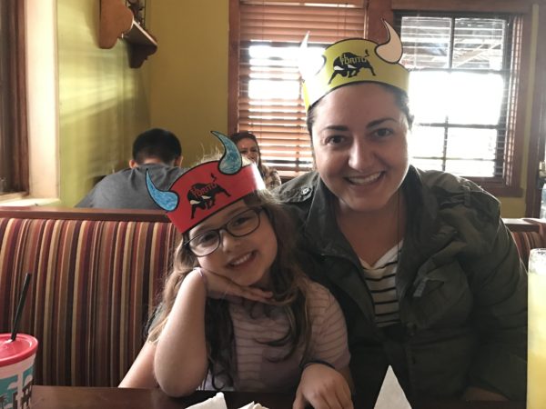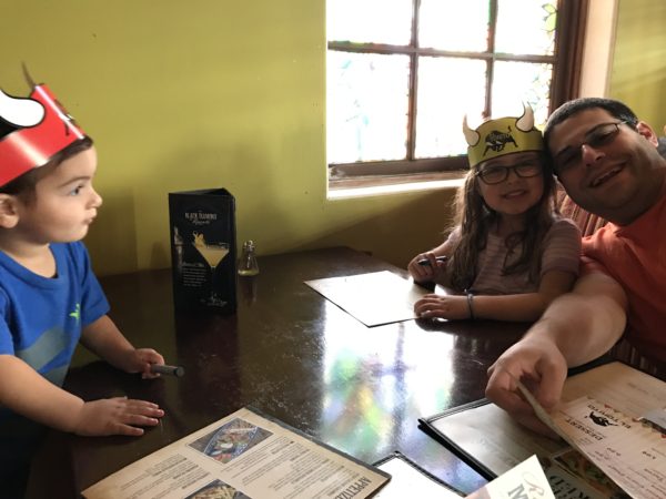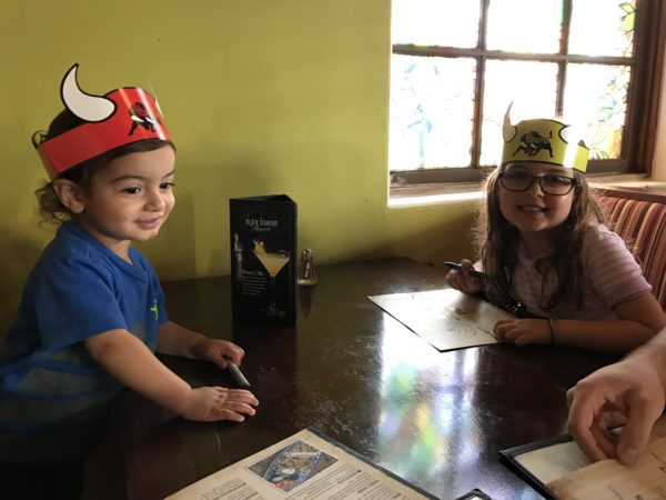 We cleaned up and drove down the street to dinner at El Torito. We had fun playing with the bull crowns while we waited for dinner.
