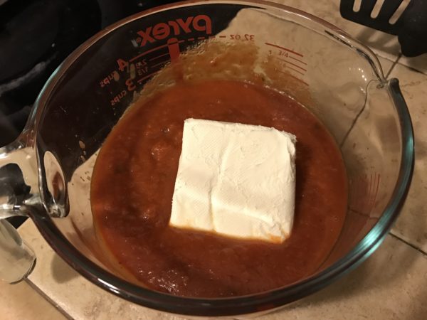 All you need is a jar of your favorite pasta sauce and 1/2 a block of cream cheese. Microwave for 2 minutes and stir.