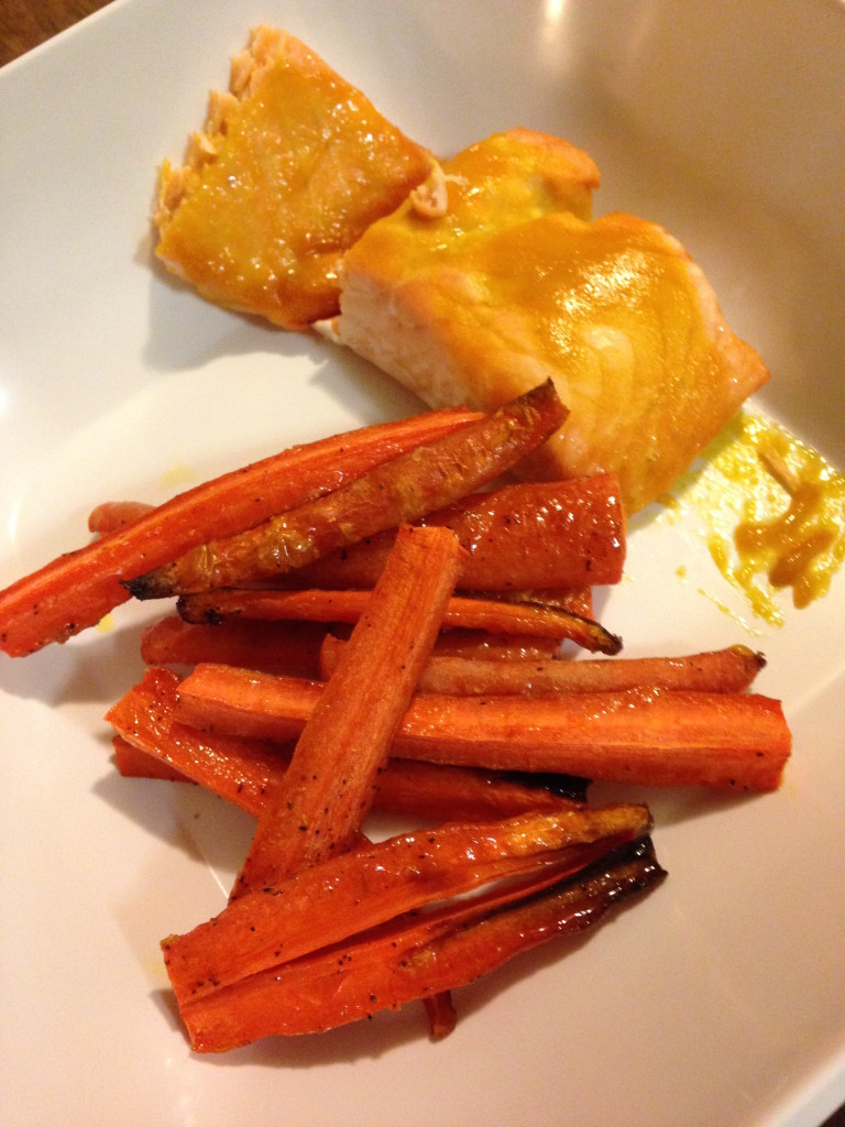 I brushed the fish with a simple sauce of Dijon and soy sauce. I cut the carrots into sticks, sprinkled them with oil, salt and pepper and roasted them at 425 for 20 minutes.