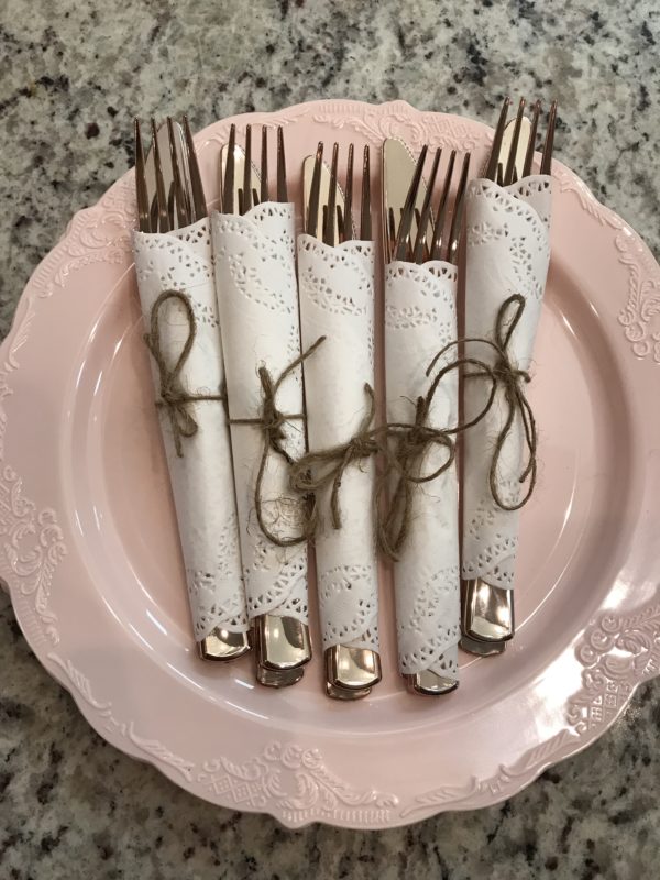 After creating a Pinterest board we put a few our ides into fruition. Like this doily wrapped rose gold silverware.
