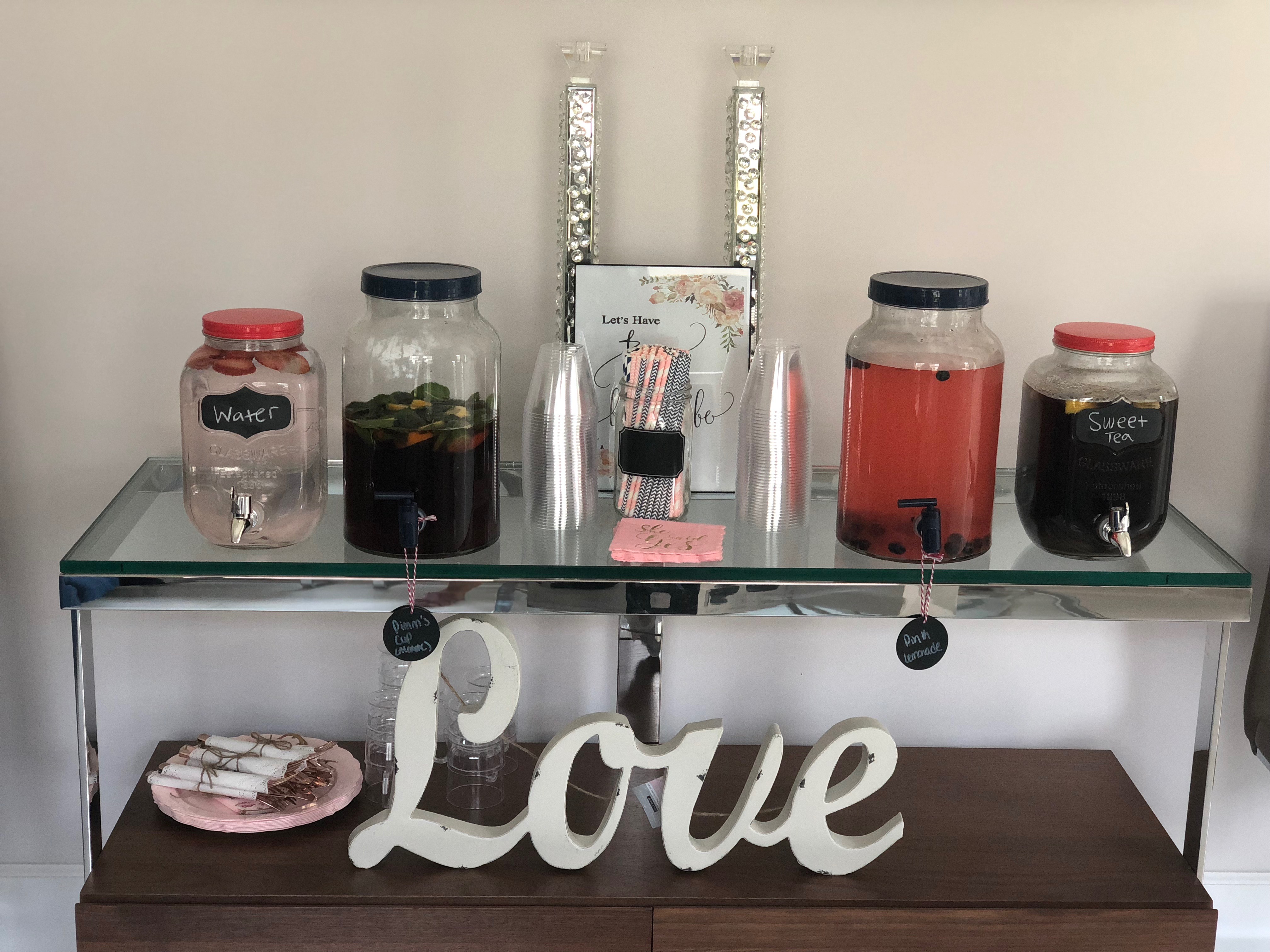 The drink station included water with strawberries, Pimms tea, pink lemonade with blueberries and sweet tea.