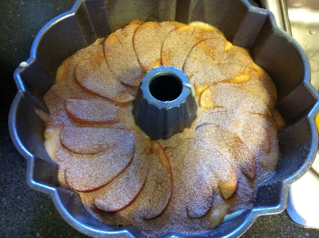 - Pour half of the batter into a greased and floured tube pan. Arrange half the apples over the batter. Combine cinnamon and sugar and sprinkle half over the apples. Top with remaining batter, apples and cinnamon/sugar.