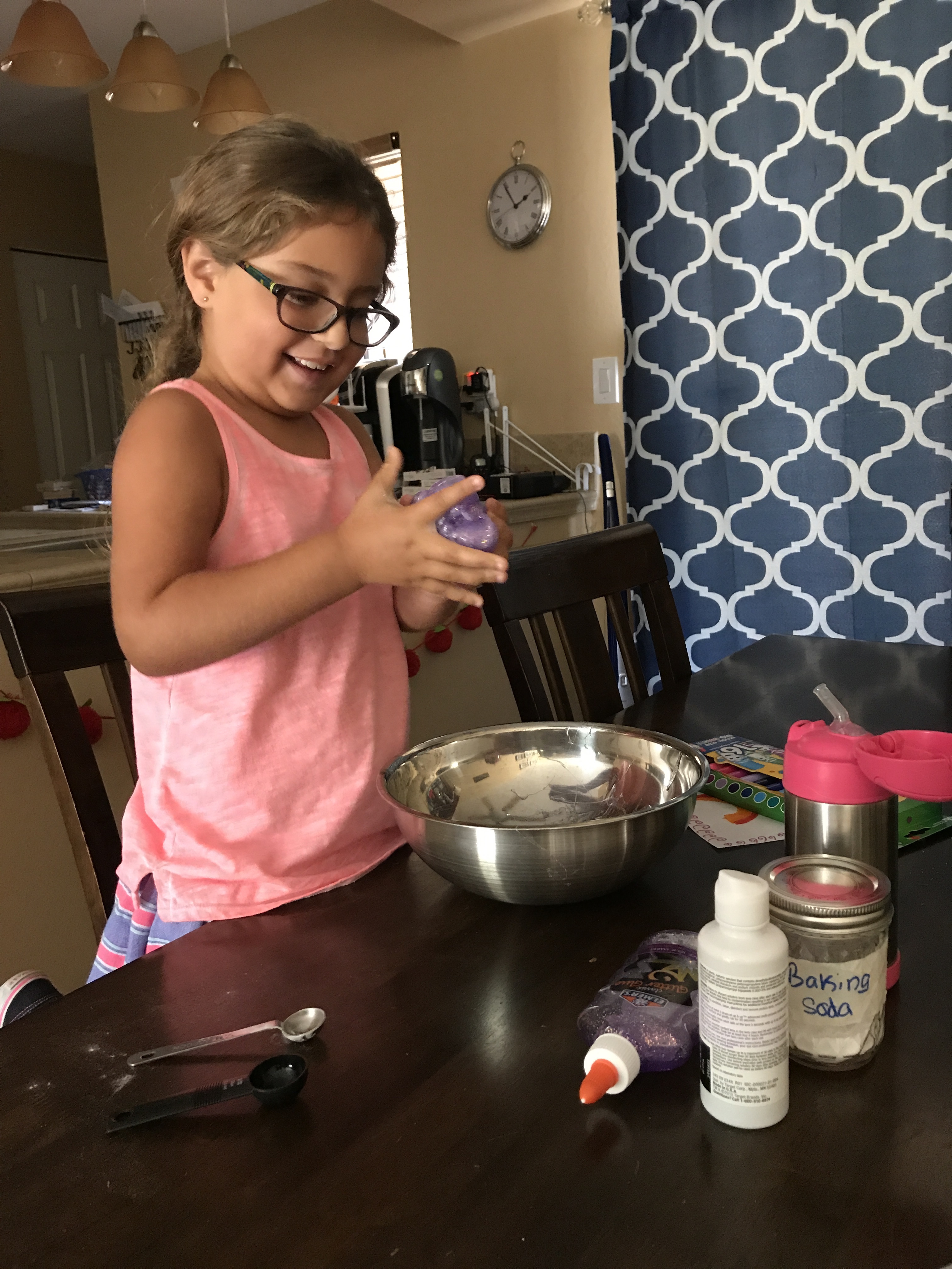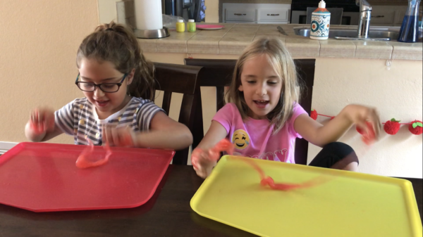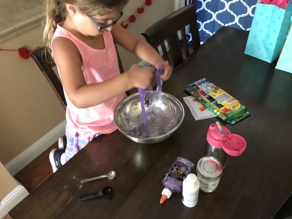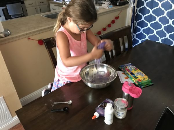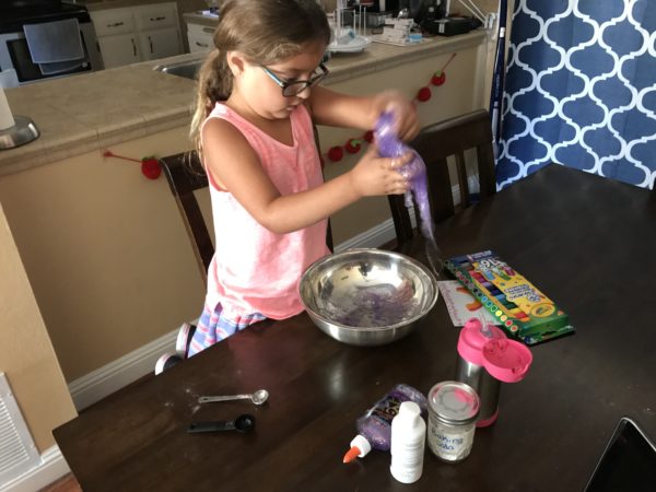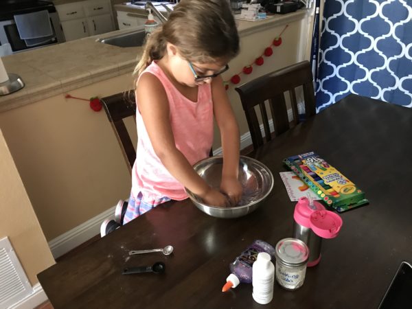 With temperatures in the high 90’s we’ve been playing indoors most afternoons. Sarah and Jacob love playing play doh, but lately it’s been getting everywhere. I saw an easy recipe for slime one day and surprised Sarah after school.