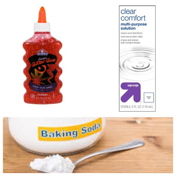 One bottle of Elmer’s glitter glue, 1 1/2 tbsp contact solution and 1/2 tsp baking soda.