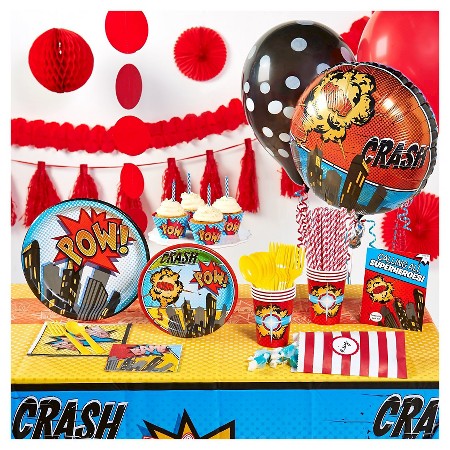 I got most of the decorations from Target this year. They had a nice superhero theme section in their decorations aisle. I also got this banner.