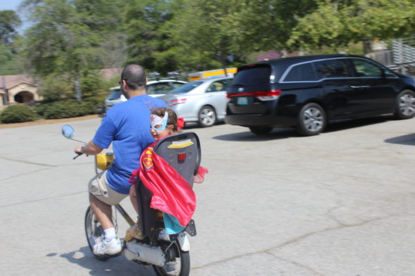 Hubby had the idea of having Sarah enter the party on his motorbike with her cape flying around.